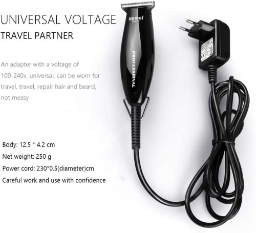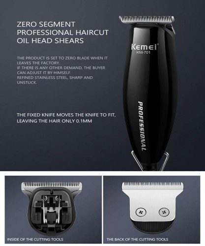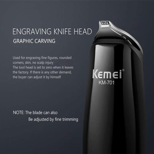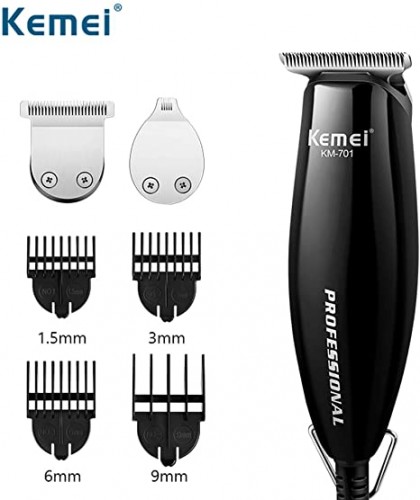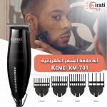 آلة الحلاقة تأتي بشفرتين و4 أمشاط مختلفة و محرك قوي اسم العلامة التجارية: Kemei الموديل: KM-701 الوزن الصافي: 250 جرام الحجم: 12.5 * 4.2 سم الجهد: 100-240 فولت الطاقة: 5 وات